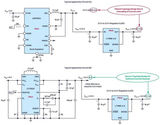 退出級聯(lián)階段時(shí),要避免限流情況。圖2所示為一個(gè)典型的級聯(lián)應(yīng)用:(A) 顯示由產(chǎn)生3.3 V電源,電流最大500 mA的ADP5304 降壓穩(wěn)壓器(PSU1)構(gòu)成的設(shè)計(jì)。為了提高效率,設(shè)計(jì)人員應(yīng)分接3.3 V電軌,而不是5 V輸入電源。3.3 V輸出被進(jìn)一步切斷,以為PSU2 (LT1965)供電,這款LDO穩(wěn)壓器用于進(jìn)一步將電壓降低至2.5 V,且按照板載2.5 V電路和IC的要求,將最大輸出電流限制在1.1 A。