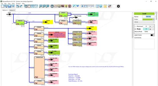 在考慮這一點(diǎn)的情況下,先創(chuàng)建真實(shí)的功率預(yù)算,然后選擇控制器。包括您所需的所有電源電軌:2.5 V、3.3 V、5 V等。包括所有會消耗每個(gè)電軌功率的上拉電阻、離散器件和IC。使用這些值反向工作,以如圖2b所示,估算您需要的電源。使用電力樹系統(tǒng)設(shè)計(jì)工具,例如LTpowerPlanner(圖3)來輕松創(chuàng)建支持所需的功率預(yù)算的電力樹。