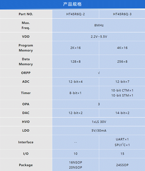 HT45R6Q-2/HT45R6Q-3具有2K/4K×16 OTP Memory、128/256×8 RAM,10/15個(gè)多功能I/O引腳。4/7個(gè)通道12-bit ADC,用于測(cè)量電壓、溫度等信號(hào),另提供一組20/40倍OPA,將電流信號(hào)放大,降低電流偵測(cè)電阻的電阻值,增加電流判斷精準(zhǔn)度,提高轉(zhuǎn)換效率。