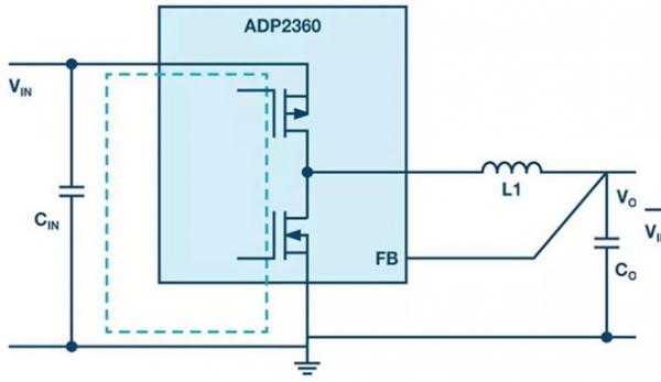 開關穩壓器在兩個不同路徑之間來回切換電流。這種切換非常快,具體切換速度取決于切換邊緣的持續時間。開關電流流經的走線稱為熱回路或交流電流路徑,其在一個開關狀態下傳導電流,在另一個開關狀態下不傳導電流。在PCB布局中,應使熱回路面積小且路徑短,以便限度地減小這些走線中的寄生電感。寄生走線電感會產生無用的電壓失調并導致電磁干擾(EMI)。