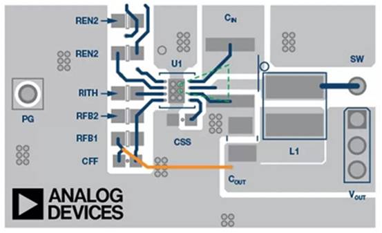 圖2所示為ADP2360的示例布局。在本圖中,圖1中的重要熱回路標為綠色。從圖中可見,黃色反饋路徑離線圈L1有一定距離。它位于PCB的內層。