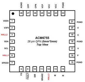 深圳市永阜康科技有限公司現在大力推廣支持3霍爾應用全集成三相直流無刷(BLDC)電機ASIC-ACM6755.該芯片工作電壓5V-28V,相電流4.8A,集成算法+預驅+MOS,QFN-28封裝。無需編寫任何應用軟件,只需通過上位機軟件對芯片的參數進行配置,從而適應不同的電機參數和性能需求。高集成度以及精簡外圍特別適用于高功率密度、小尺寸、靜音要求高的三相無刷電機驅動器應用場景。