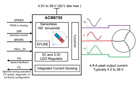 ACM6755支持多種驅動方式,包括無感180゜正弦驅動、無感方波驅動,有感方波/正弦驅動以及開窗正弦驅動.其中無感180゜正弦有效避免因高次諧波導致的電磁音干擾,有感方波/正弦驅動可以有效應對變負載類應用. ACM6755可以根據用戶提供的電機參數進行有效啟動、加速以及恒轉速運行.用戶參數可以通過燒寫長期固定(硬件模式,內部EEPROM 編程燒寫)或者通過I2C在線控制(軟件模式,通過I2C寄存器進行參數初始化或者在線控制)。 ACM6755支持多種速度控制.外部PWM占空比調速、外部模擬電壓調速、I2C寄存器調速以及外部PWM頻率調速.