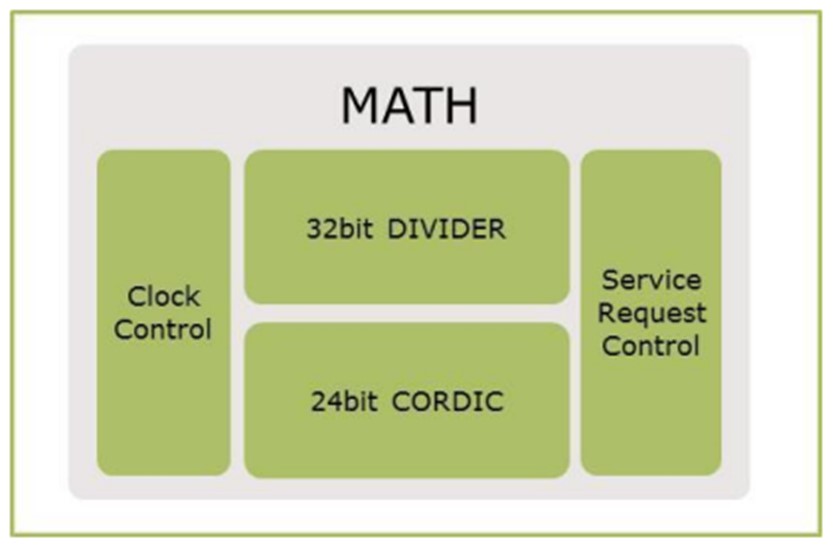 XMC1302中集成一個MATH協處理器,它完全獨立于CPU,工作在PCLK(64MHz)時鐘下。MATH協處理包含了一個32位的DIVIDER和一個24位的CORDIC。DIVIDER單元實現32bit有符號/無符號除法。CORDIC單元實現24bit三角函數運算。DIVIDER和CORDIC單元可并行工作,該模塊減輕了CPU的負荷,對于實現無感FOC控制算法提供了良好的支持。