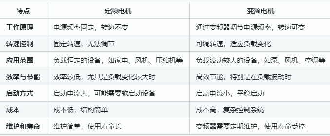 定頻電機和變頻電機的主要區別在于其電源頻率的控制方式,進而影響它們的工作原理、性能、應用范圍和效率等方面。以下是這兩者的詳細對比: