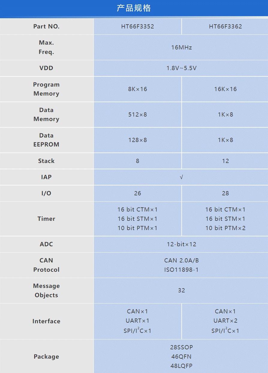 HT66F3352/HT66F3362系統資源最大16K×16 Flash程序存儲器、1024×8 SRAM及1024×8 True EEPROM等核心規格,其他實用的周邊電路,包含多功能定時器模塊、12-bit ADC、比較器、IAP、SPI/I²C/UART通信接口,應用溫度范圍-40℃~105℃。封裝提供28-pin SSOP、46-pin QFN、48-pin LQFP。