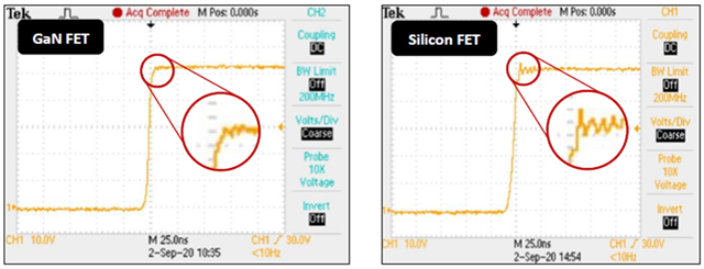 4. 開關波形比較:GaN FET波形(左)和Si FET波形(右)
