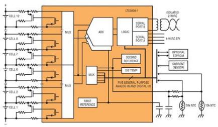 這就是 LTC6804 多電芯電池監(jiān)控器 IC(圖 4)在 Nuvation BMS 實(shí)施中起關(guān)鍵 作用的原因。它專(zhuān)為滿足 BMS 系統(tǒng)和多電芯設(shè)計(jì)需求而定制,可對(duì)多達(dá) 12 個(gè)串 聯(lián)堆疊的電池電芯進(jìn)行精確測(cè)量。其測(cè)量輸入不以接地作為參考,這大大地簡(jiǎn)化 了這些單元的測(cè)量,而 LTC6804 本身可進(jìn)行堆疊與高電壓陣列一起使用(它還支 持各種電芯化學(xué)特性)。它提供最大 0.033%誤差和 16 位分辨率,只需要 290μs  即可測(cè)量電池堆棧中的所有 12 個(gè)電芯。這種同步電壓和電流測(cè)量對(duì)于產(chǎn)生有意 義的功率參數(shù)分析至關(guān)重要。