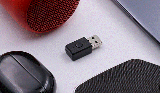 這款尺寸為 32.8 x 16.3 x 8.5 毫米的音頻發射器加密狗可提供簡單易用的即插即用操作。插入任何主機設備(如 Windows PC 或 MacOS 電腦、平板電腦或電視機)的 USB-A 端口后,可通過下拉菜單進行配置,其中包括一個按鈕,用于與一個或多個接收設備配對并進行音頻廣播。