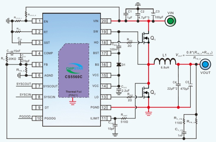 CS5560C強制PWM模式運行,可以消除開關頻率變化從而盡可能地降低EMI,而用戶可選的輕載PSM模式則可以降低輕負載條件下的電流消耗。可調開關頻率可同步至外部時鐘源,從而消除噪聲敏感應用中的干擾。TSSOP-20封裝。