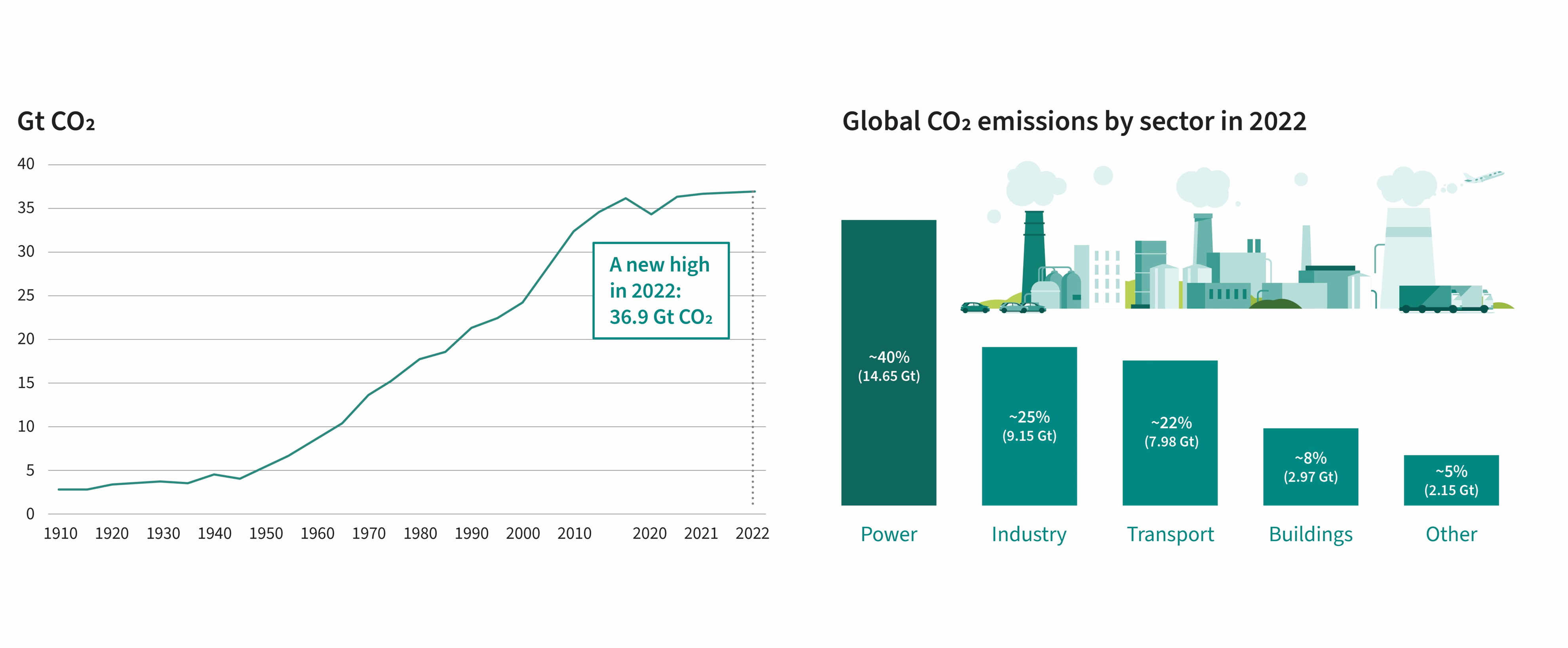 圖1:1910年以來全球二氧化碳排放量(單位:千兆噸):總量(左);按行業劃分(右)