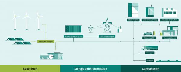為了實現這些目標,我們必須找到解決方案,以便在電力全鏈條(發電、輸電、儲電和用電)的各個環節實現更智能、更高效的能源管理。而功率半導體技術則是這一鏈條各環節的核心所在。
