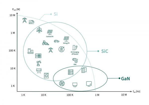 圖4展示了硅、SiC和GaN這三種功率半導體技術的共存關系。盡管硅基技術仍是眾多應用的主流選擇,但SiC技術在需要使用400 V-3.3 kV器件的諸多應用中,與前者互為補充,能夠提供更好的散熱性能、更高的可靠性和更為緊湊的解決方案。GaN技術在40 V-750 V的低壓范圍內,與硅基技術競爭激烈,特別是在高開關頻率和較低的功率下,優勢更為明顯。