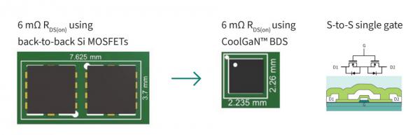 圖6:CoolGaNTM  BDS與背對背硅基MOSFET相比更節省空間