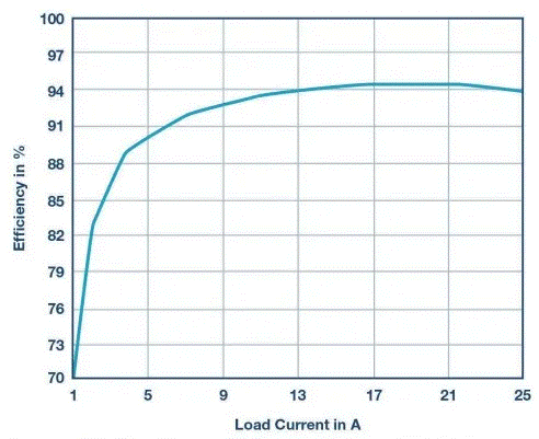 圖4顯示了不同負載電流下48 V輸入電壓和5 V輸出電壓的典型轉換效率。在大約6A時,轉換效率超過90%。在13 A和24 A之間, 效率甚至高于94%。