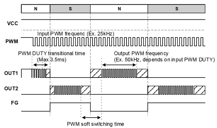 OUT1/OUT2 電機驅動信號的極性隨著檢測到的磁極性的變化而反轉。