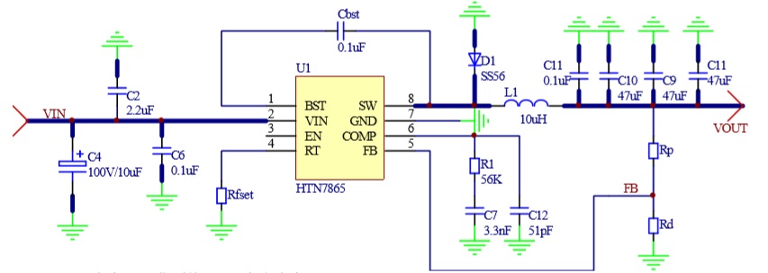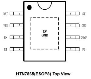 HTN7865是5A降壓轉換器,具有從4.5V到65V的寬輸入電壓,集成了90mΩ高側MOSFET。HTN7865采用峰值電流模式控制, 支持跳周期調制(PSM),有助于轉換器在輕負載下實現高效率。HTN7865具有100kHz至2MHz的可編程開關頻率,外部電阻可調。 HTN7865允許從高輸入電壓到低輸出電壓的功率轉換,開關MOS的最小導通時間為120ns。 該設備提供典型2.5ms的固定軟啟動,以防止啟動過程中的涌入電流。HTN7865具有外部環路補償功能,可靈活優化環路穩定性或環路響應。HTN7865提供逐周期電流限制、熱關斷保護、輸出過壓保護、輸出過載保護和輸入電壓欠壓保護。該設備采用ESOP8封裝。