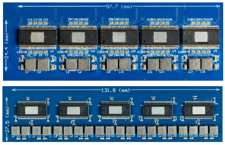 圖 2 展示了采用 1L 調制技術的放大器如何將 20 個通道的音響系統的電感器數量減少到 10 個通道,使得尺寸減小 34%。
