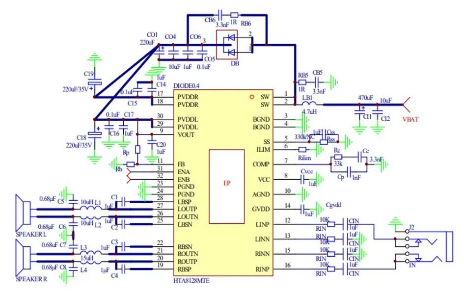 此外,HTA8128內部集成免濾波器調制技術,能夠直接驅動揚聲器,內置關斷功能,輸出端過流保護、片內過溫保護、輸入電源欠壓異常保護、升壓電壓過壓保護等功能。