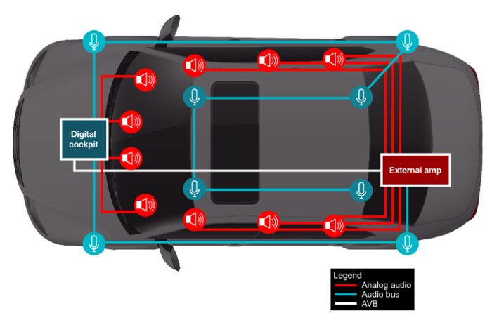 過去,高端汽車音響系統中的數字放大器采用分布式架構進行音頻處理,由單獨的 MCU、數字信號處理器 (DSP) 和網絡集成電路 (IC) 處理不同的任務。雖然這種分立式方法通常提供了設計靈活性,但也增加了系統復雜性、成本和尺寸。為了增加沉浸式環繞聲和道路噪聲消除 (RNC) 以提供家庭影院般的體驗,同時優化燃油和能源效率,需要增加元件、音頻通道和軟件類型的數量。圖 1 展示了現代車輛中的音響系統示例,其中包含用于環繞聲的多個揚聲器和用于 RNC 的麥克風。