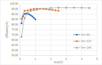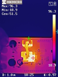 從熱成像圖可以看出,DEMO板在高負載條件下,溫度分布均勻,沒有局部過熱現象。在VIN=12V, VOUT=48V, IOUT=2A的條件下,最高溫度點為96.3℃,在VIN=24V, VOUT=48V, IOUT=4A的條件下,最高溫度點為95.2℃