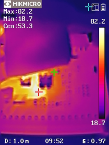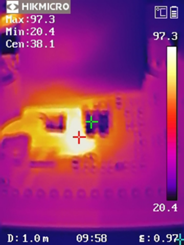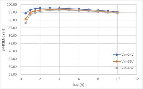 從熱成像圖可以看出,DEMO板在高負載條件下,溫度分布均勻,沒有局部過熱現象。在VIN = 24V, VOUT = 12V, IOUT = 10A 的條件下,最高溫度點為82.2℃,在 VIN = 48V, VOUT = 12V, IOUT = 10A 的條件下,最高溫度點為97.3℃