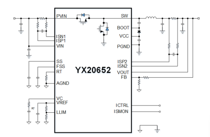 YX20652 是一款全集成MOS的高效同步降壓轉換器,其輸入電壓范圍可達4V至60V,最大輸出電流可達12A,最高效率可達97%。得益于MOS管全集成化設計,YX20652大幅簡化了轉換器的外圍電路,使得整板體積更小,功率密度更高,系統成本進一步降低。此外,該產品還具備并聯錯相功能,方便功率擴展的同時,有效降低了輸出紋波,提升了系統的穩定性和可靠性。