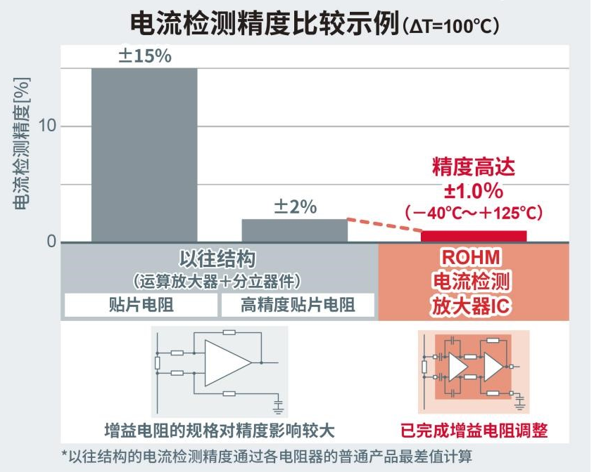 新產品將以往運放+分立器件的運放電路方式進行一體化封裝,更加節省空間,僅通過連接分流電阻器即可進行電流檢測。另外,新產品采用兩級放大器結構,輸入級采用斬波放大器*3,后級采用自穩零放大器*4,通過在IC內部匹配決定增益精度的電阻,不僅可抑制溫度變化的影響,還可實現±1%的高精度且穩定的電流檢測。
