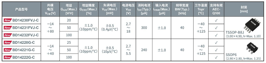全球知名半導體制造商ROHM(總部位于日本京都市)今日宣布,最新推出符合車規標準AEC-Q100*1的高精度電流檢測放大器“BD1423xFVJ-C”和“BD1422xG-C”。采用TSSOP-B8J封裝的“BD1423xFVJ-C”支持+80V的輸入電壓,適用于48V電源驅動的DC-DC轉換器、冗余電源、輔助電池、電動壓縮機等高電壓環境。根據其增益設置可分為“BD14230FVJ-C”、“BD14231FVJ-C”和“BD14232FVJ-C”三種型號。采用小型SSOP6封裝的“BD1422xG-C”支持+40V的輸入電壓,非常適用于車身和驅動控制單元中5V/12V驅動的電源網絡中的電流監測和保護(過電流檢測)等需要節省空間設計的車載設備。根據其增益設置,可分為“BD14220G-C”、“BD14221G-C”和“BD14222G-C”三種型號。