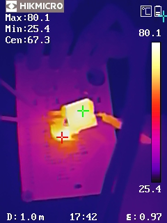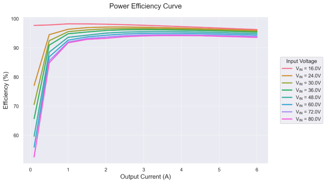 從熱成像圖可以看出,DEMO板在高負載條件下,溫度分布均勻,沒有局部過熱現象。在VIN = 64V, VOUT = 12V, IOUT = 5A 的條件下,最高溫度點為80.1℃,在 VIN = 80V, VOUT = 12V, IOUT = 5A 的條件下,最高溫度點為90.6℃。