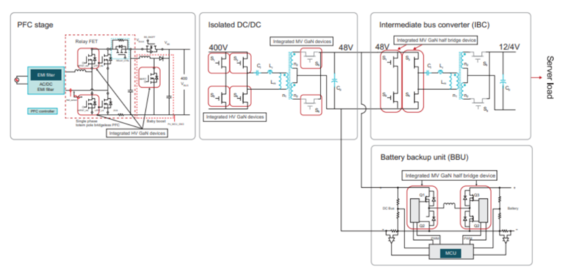 針對中壓GaN,服務器電源應用中的三個主要系統(tǒng)可以采用 100V 至 200V 的 GaN: