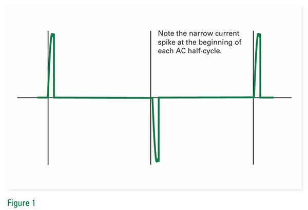 由于 LED 是二極管,因此其穩態電流比白熾燈低得多,而且它們在交流電壓的每個半周期里的初始開啟電流可能高得多且持續時間約幾微秒。因此,在每個交流電壓半周期的開始處都可以看到電流尖峰。圖 1 顯示了典型的電流尖峰。通常,交流二極管替換燈的電流尖峰為 6-8 A 峰值;穩態電流小于 100 mA。