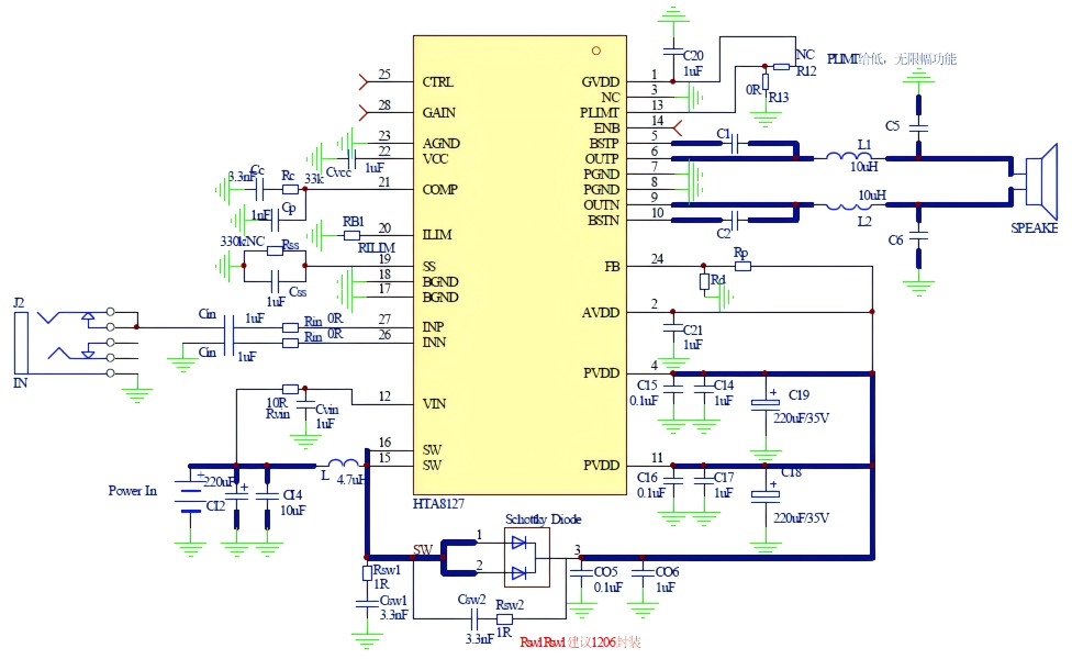 HTA8127是一款內(nèi)置升壓的單聲道D類音頻功放IC,其支持單節(jié)鋰電、雙節(jié)鋰電串聯(lián),5V、12V等多種輸入,升壓后的電壓提供給功放供電,功放支持單聲道BTL輸出。HTA8127內(nèi)部集成免濾波器調(diào)制技術(shù),能夠直接驅(qū)動(dòng)揚(yáng)聲器,內(nèi)置的關(guān)斷功能使待機(jī)電流最小化,還集成了升壓電壓過壓保護(hù)、輸入電源欠壓異常保護(hù)、輸出端過流保護(hù)、片內(nèi)過溫保護(hù)等功能。HTA8127內(nèi)置的升壓電路,可通過FB腳設(shè)置升壓值,以滿足不同的輸出功率需求。其還可通過外置電阻調(diào)節(jié)開關(guān)峰值電流限值。