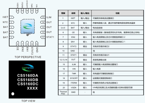 CS5160D是一款鋰離子電池線性充電器,適用于空間受限型便攜式應(yīng)用的系統(tǒng)電源路徑管理,兼顧多種類型太陽能板充電及適配器輸入,支持1mA-1.5A的充電電流。USB輸入電流限制精度和啟動序列使得這款芯片能夠符合USB-IF涌入電流規(guī)范。