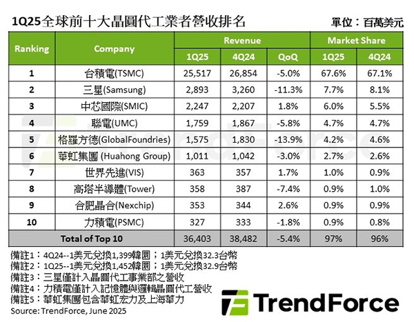 從廠商排名上看,臺(tái)積電以67.6%市占率穩(wěn)居第一,其晶圓出貨雖因智能手機(jī)備貨淡季而下滑,部分影響由穩(wěn)健的AI HPC需求和電視的關(guān)稅避險(xiǎn)急單抵銷,營(yíng)收為255億美元,季減5%。 第二名的三星因美國(guó)先進(jìn)制程禁令限制中國(guó)大陸客戶投產(chǎn),以及其客戶組成關(guān)係,獲得中國(guó)大陸消費(fèi)補(bǔ)貼的紅利有限,第二季度營(yíng)收季減11.3%,為28.9億美元,市占微減至7.7%。中芯國(guó)際受惠于客戶因應(yīng)美國(guó)關(guān)稅提前備貨,和中國(guó)大陸消費(fèi)補(bǔ)貼提前拉貨等因素,削弱ASP下滑的負(fù)面效應(yīng),營(yíng)收季增1.8%,達(dá)22.5億美元,排名第三。另外,中國(guó)大陸晶圓代工廠華虹集團(tuán)以10.1億美元的營(yíng)收排名第六,其旗下HHGrace新產(chǎn)能出貨貢獻(xiàn)營(yíng)收,以及通過(guò)部分產(chǎn)品的低價(jià)策略吸引客戶投片,營(yíng)收水準(zhǔn)大致與前季相同。合肥晶合第一季亦接獲客戶因應(yīng)美國(guó)關(guān)稅、中國(guó)補(bǔ)貼政策的急單,投片產(chǎn)出季增,帶動(dòng)營(yíng)收增長(zhǎng)2.6%,上升至3.53億美元,排名第九。