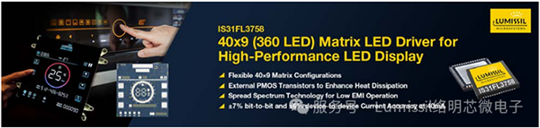 近日絡明芯發布高亮度、高靈活性、高可靠性LED驅動芯片IS31FL3758。該芯片支持最大40×9矩陣,單芯片驅動多達360個單色LED燈珠或117個RGB LED燈珠。芯片支持每個LED 256級 PWM調光和3組256級全局電流調節,能夠實現細膩亮度控制。目標應用市場包含白色家電顯示面板、LCD屏區域背光和游戲機,鍵盤等。
