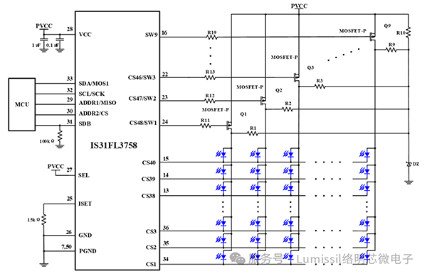 IS31FL3758內置48路恒流源,每個通道的最大輸出電流可達60mA。芯片不僅支持48通道的獨立驅動,還能通過控制2~9個外部功率PMOS,靈活配置為46×2、45×3……40×8、40×9的LED矩陣。這種靈活架構使其既能滿足單通大電流、高亮度的應用需求,又能適應各種不同尺寸和分辨率的大型矩陣顯示場景。芯片內部集成掃描時序控制電路,大大簡化MCU的控制復雜度。掃描管外置設計,將掃描管的功耗轉移到外部PMOS管,對于大電流,高功率的應用能夠大大降低芯片的溫升。