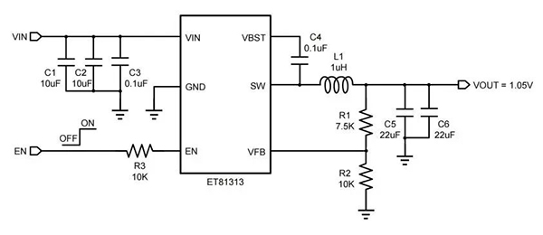 ET81313采用了SOT563形式的小封裝,配合高度集成的內部電路以及簡單的外部器件,能夠以更小的應用面積去布局。