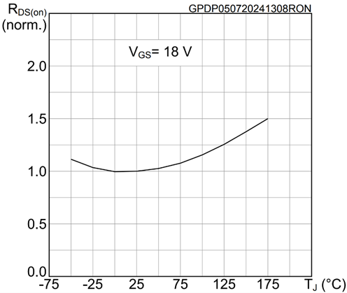 然而,從25°C至175°C其導(dǎo)通電阻Rdson僅上升約50%,與標準硅基MOSFET相比,這一增幅明顯更低,傳統(tǒng)硅基MOSFET在150°C(而非175℃,這是其絕對最高額定溫度)時RDSon增幅可達200%。