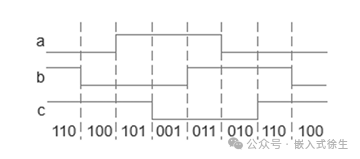 在無刷電機中一般把3個霍爾傳感器間隔120°的圓周分布安裝如圖所示。輸出信號高低電平各占180°角。設輸出的高電平為1,低電平用0表示,則輸出三個信號用二進制編碼表示如上表。