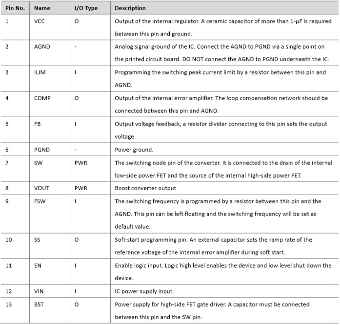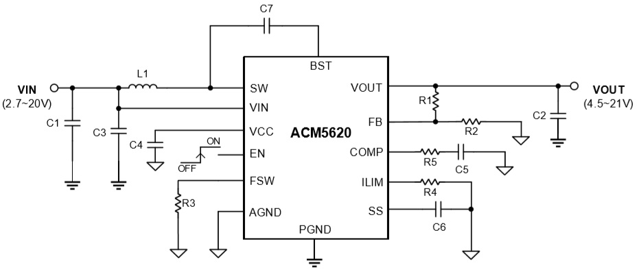 ACM5620采用自適應恒定關斷時間峰值電流控制模式,以調節輸出電壓并確保快速瞬態響應。ACM5620在脈沖寬度下工作中、重載時的調制(PWM)模式,隨著負載電流的減小切換到脈沖頻率調制(PFM)模式以保持高效運行。ACM5620提供準確在寬負載和VIN范圍內進行調節,并保持低輸出紋波。ACM5620提供22.8V的過電壓保護,電流跟蹤保護和過熱保護。