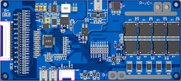 SoC計算,充放電功率通路和可選的BT/WiFi通信和RS-485通信。該BMS方案將電池組單體電壓、電流、溫度進行實時監控并上報用戶,并根據用戶設定的保護參數進行自我控制,在電池組工作異常的情況下及時關斷充放電。該方案通用性比較強,可以根據用戶需求,在10~17串范圍內電池串數,采用低邊驅動同口設計方案,充放電電流高達60-80A,兼容NCM、LFP等鋰電池。