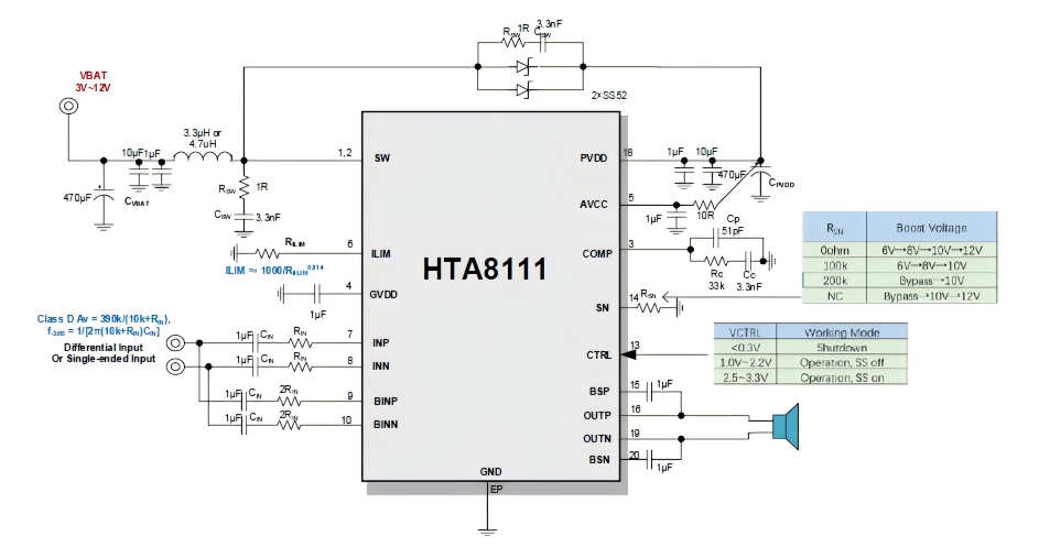 HTA8111內(nèi)置可動態(tài)調(diào)節(jié)的升壓,可提供一個(gè)適應(yīng)不同輸出功率的電壓給D類功放,可大幅提高系統(tǒng)效率,延長電池續(xù)航時(shí)間。還可配置升壓限流值,以防止過大的電流尖峰。