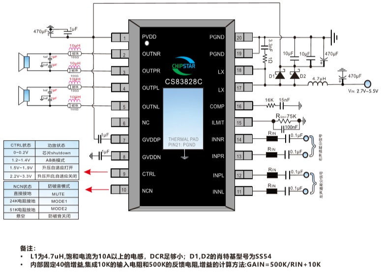 CS83828 PO at 1% THD+N, VIN = 4.2V RL = 4 Ω+22uH 2×9.2W CS83826 TSSOP-20 2.7V-5.5V 適用于單節鋰電池供電應用,靜音功能,4個自適應升壓點,兩種防破音可選,AB/D類切換2×9.2W@1%輸出功率立體聲音頻功率放大器