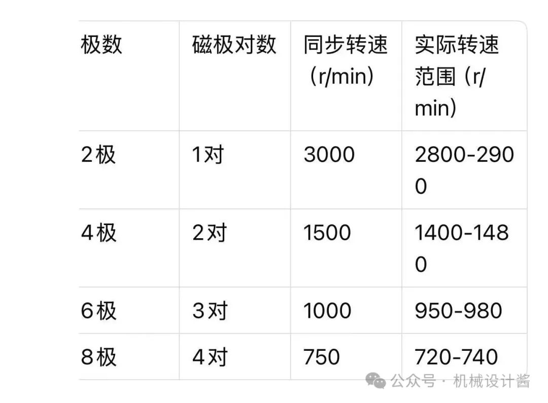 根據(jù)這個公式,我們可以計算出不同極數(shù)電機在50Hz電源下的同步轉(zhuǎn)速: