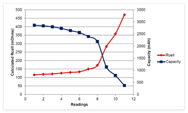 跟蹤電阻對于在電池的整個使用壽命期間提供最高精度的荷電狀態計算至關重要。如圖 2 所示,電池單元的電阻會隨著電池的循環和老化而線性增加,直到達到某個轉折點,在此轉折點處,電阻會呈指數級增長,直至電池壽命結束。電阻也會隨溫度而發生顯著波動。電池單元的電阻與溫度呈反比關系,溫度越低,電阻越高;因此,電池單元在達到 0% 荷電狀態之前所能提供的容量或能量就越低。