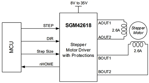 在技術規格方面,SGM42618 的電機電源電壓范圍為 8V 至 35V,每個繞組的電流可高達 2.6A。+25℃ 環境溫度下導通電阻僅為
