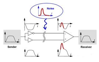 圖2:差分信號傳輸原理圖(噪聲抑制與信號還原)