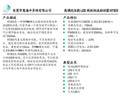 惠海半導體推出的DC-DC降壓型線性恒流調光芯片H7303系列專為高調光性能、低成本的LED調光需求設計。下文為該系列芯片的一個簡單介紹,更多的應用資料及產品規格書請到惠海半導體官網。