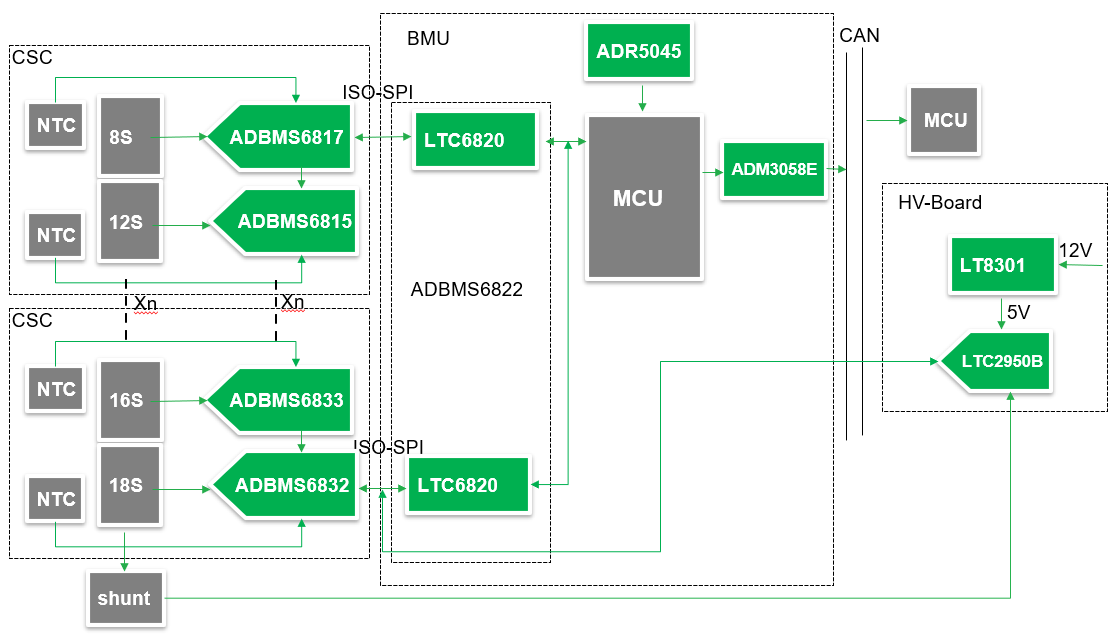 ADI的電池解決方案能夠提供全溫度范圍內的高精度、高可靠性,并且支持ASIL-D的安全等級,在多變的電池包結構中提供完整的電池通道選擇,可以做到模組化的任意組合和連接。通過菊花鏈的連接方式使整個系統的線束連接更簡潔,更優化。